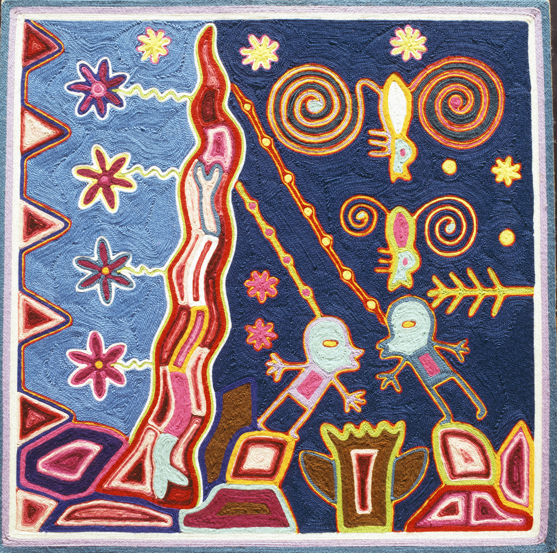 Thus, here we see Tatewarí (bottom center), Our Grandfather, the master of fire, and to his right, Taweviékame, Our Father, who became the sun, as they stand in front of a prayer-mat, itari, making contact with each other through their soul (small pink flowers) and their memories (bug-like figures above them with swirls of wind attached like wings). Two yellow dots represent the information which the two ancestors receive from each other.