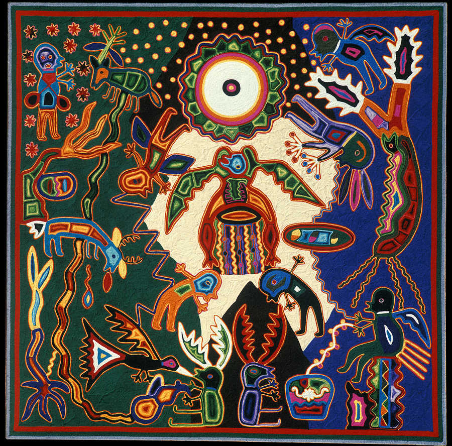 Los Antepasados se mantienen por medio de su kipiri (alma), con su nierika, con su ‘iyari (corazón/memoria) y con su tukari (energía vital). La deidad solar está ligada a Pariya, el Espíritu del Amanecer (figura naranja abajo y a la izquierda del águila central). Ambos están en la Tierra Sagrada donde el Sol se levanta. Ahí también se localiza el nierika de Kauyumarie y de Nuestro Bisabuelo Cola de Venado, con cuernos rojos, aparece en su templo (el espacio oscuro bajo el águila). Se le representa también como persona (frente a la figura anaranjada del Espíritu de la Aurora). En el templo está la figura de Nuestra Madre el Mar: una garza le trae un bule del que se hace una jícara votiva. La sangre del Venado Azul (al centro izquierda), da vida a las jícaras votivas y al maíz, por esto una mazorca de maíz crece hasta encontrar sus patas posteriores (margen inferior izquierdo). El camino verde encima de Venado Azul es una vena de agua sagrada para alimentar el alma. La jícara de Nuestro Padre Sol está bajo las llamas del fuego (arriba de Venado Azul) junto a la corriente de agua. De esta manera, Nuestro Padre Sol, a través de su memoria que se encuentra en la jícara, y Nuestro Abuelo Fuego, a través de sus llamas/plumas, se mantienen en acuerdo.