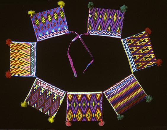 Aquí vemos un ejemplo de la carrillera, una serie de pequeñas bolsas bordadas o tejidas, luego cocidas para formar una faja usada por los hombres wixáritari. La carrillera se utiliza con la faja de lana tejida o de algodón que se enrolla varias veces alrededor de la cintura. Este ejemplo está bordado con una técnica diagonal de dos puntos llamada 'punto de oro'. El bordado fue hecho en manta fina que una vez fue producida por la fábrica de Bella Vista en las afueras de Tepic, Nayarit.