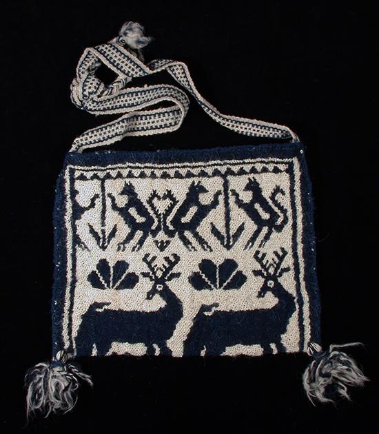 Este morral, kutsiuri en wixárika, fue tejido con un telar de cintura utilizando lana virgen hilada a mano y teñido con tinta a base de plantas nativas. Los diseños representan venados, ardillas y peyote.
