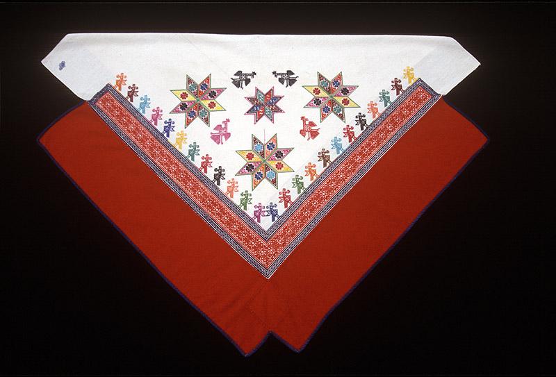 Esta fina capa de hombre, o tuwara en wixárika, fue bordada con la punta de cruz más fina, o sea punto de oro. Los diseños representan la clásica estrella wixárika de ocho puntos, pájaros y peyotes. El bordado se hizo sobre manta fina que se produjo en la fábrica de Bella Vista que operaba durante muchos años en las afueras de Tepic, Nayarit. Está bordada con hilos de algodón y adornada con lana roja con un pedazo de algodón azul al final.