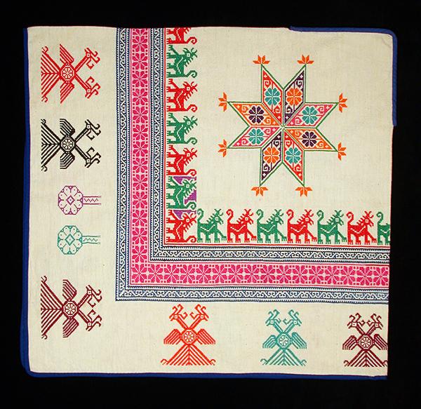 Este velo para niña, o xikuri en wixárika, está bordado en manta de algodón y con un bordado de dos puntos con hilo teñido con anilina con las orillas terminadas con tela de algodón azul. El xikuri es típicamente utilizado en la cabeza pero también con un quexqueme. Los diseños en esta pieza son de la estrella tradicional de ocho puntos con un peyote, un puma y un águila bicéfala. Hoy en día aún vemos muchos xikurite hechos de manta y bordados, aunque también muchos hechos de paliacates y tela comercial de algodón.