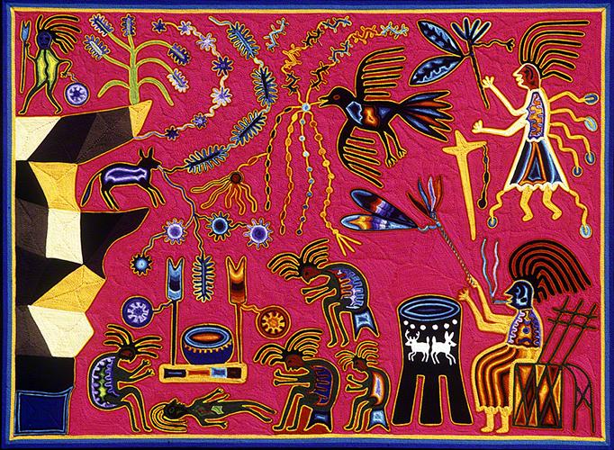 Tamatsí Kauyumarie había esperado en una cima picuda (esquina izquierda superior del cuadro) en un área donde los Hewixi vivían llamado Kiripi Nakatá que significa “adentro” (nakatá) del “caracol” (kiripi), debido a la cueva profunda debajo de la cima. Antes de que descendiera, cubrió el piso con las hojas espinosas de la planta de tauxirra (huizapol, planta verde con erizos azules, izquierda superior). Luego, llegó al área donde dormían los Hewixi, reemplazó la jícara y las flechas y se fugó por la cima de la montaña. Los Hewixi despertaron y, al descubrir su pérdida persiguieron a Tamatsí Kauyumarie. Cada vez que se le acercaban, este se transformaba en otra forma, animal, planta o mineral. Y el zorro y cuervo arrojaron más hojas de tauxirra en el camino, las agujas en forma de cuerno del ‘upá y las espinas de ruxi (dos variedades de acacia).**