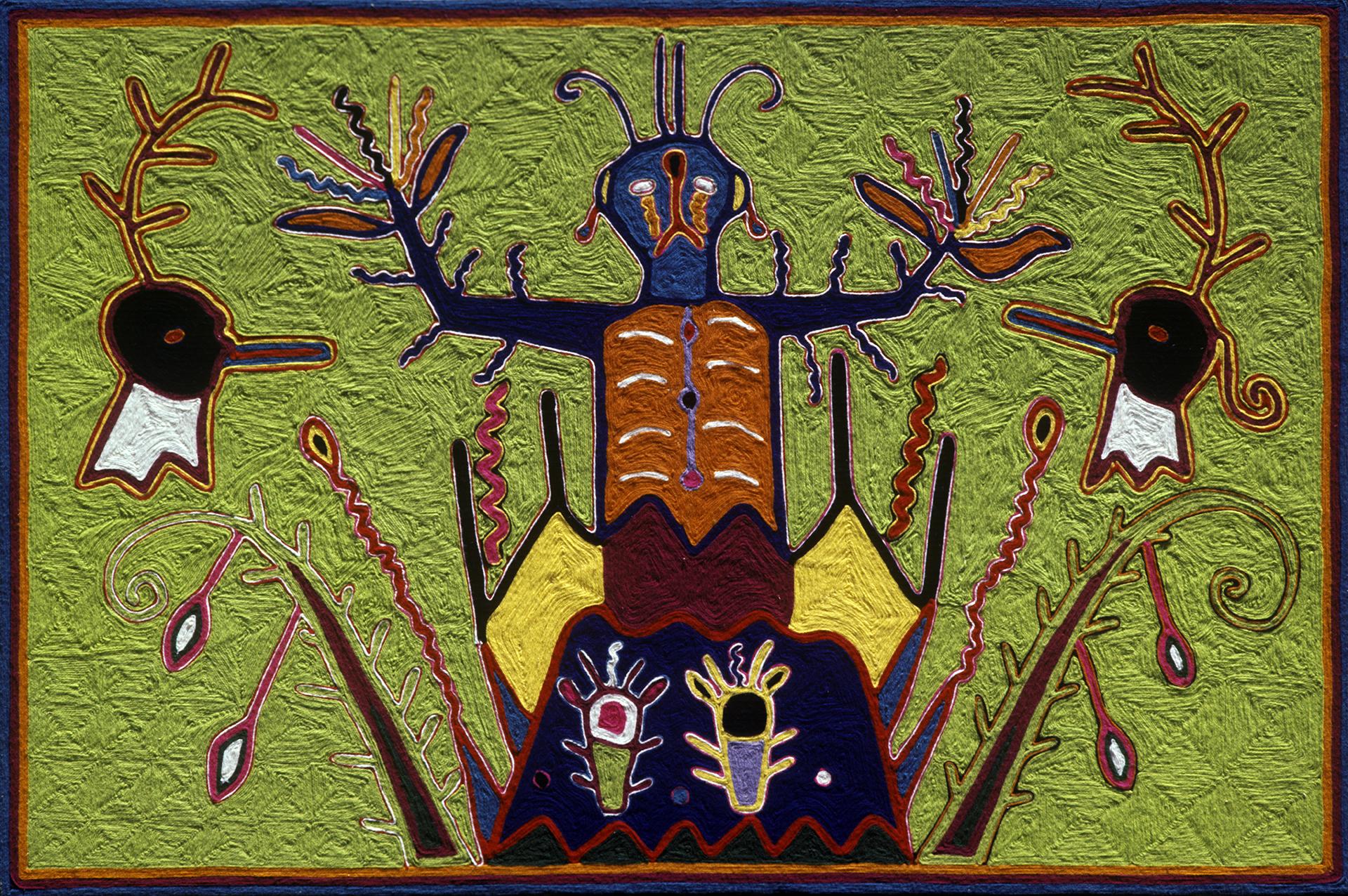 Wool yarn pressed into pure beeswax spread on plywood with wood frame