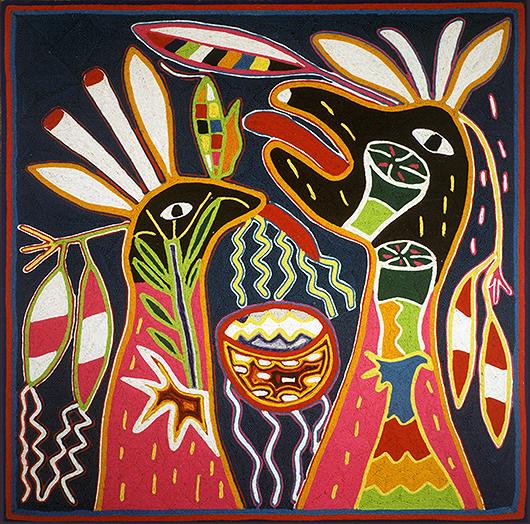 Deer-Tail, Maxakuaxí, (at right) and Fawn of the Sun, Kauyumarie, (at left) relate around a calabash votive-gourd, xukuri, that has been deposited in Wirikuta, the sacred land where Our Ancestors dwell in the east and the 'land where our ancestors paint sacred designs on our faces', Wírikuta, by the pilgrims to that sacred land of dawn. This is where Our Elder-Brothers reside in the east to transmit the words of our ancestors to us and to intercede with them on our behalf. The bowl is a prayer and an offering from mankind.