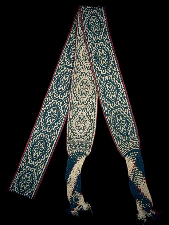 This belt (huayame) was woven in the early 1960s of hand spun and indigo dyed wool and uses a single strand of commercially dyed red wool to accentuate the edges. The center motif is the traditional eight point star often seen in Huichol weaving and embroidery and the ends are finished with a fine braiding. The huayame is mostly worn by men and is wrapped several times around the waist.