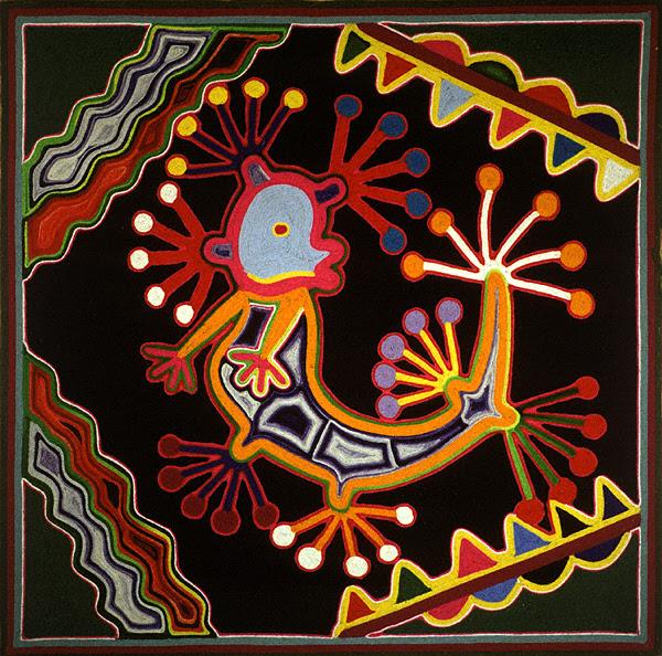 Here we see Tamatsí Kauyumarie. His body is filled with words of all kinds, of chants and of prayers. He received all of the words of the Ancestors, that represent an all-encompassing understanding of what occurs in this world, and only he has travelled throughout the world. He did not require study to become a ma’arakame, for this gift was born from within himself, within his own body. He knows well all that we say and what the gods say. He knows how many gods exist and what they require daily. In truth, this “man” knows everything and does everything. Tamatsí Kauyumarie extends himself to all parts of the world, gathering words through his body’s tenticles. When he extends his body, Kauyumarie transports himself from the sacred land of Wirikuta, in the east, to the borders of darkness in Watetiapa, at the edge of the sea. Kauyumarie is suspended in the wind.